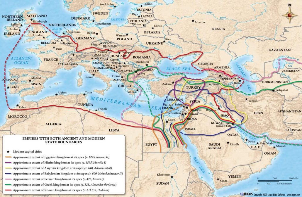 This map is from slide 1 of www.understandchristianity.com/timelines/chronology-latter-prophets-intertestamental-period. The empires in this map do not extend back to Abraham’s time, but it does give a good ideas about how the “Promised Land” was continuously overrun by one empire after another